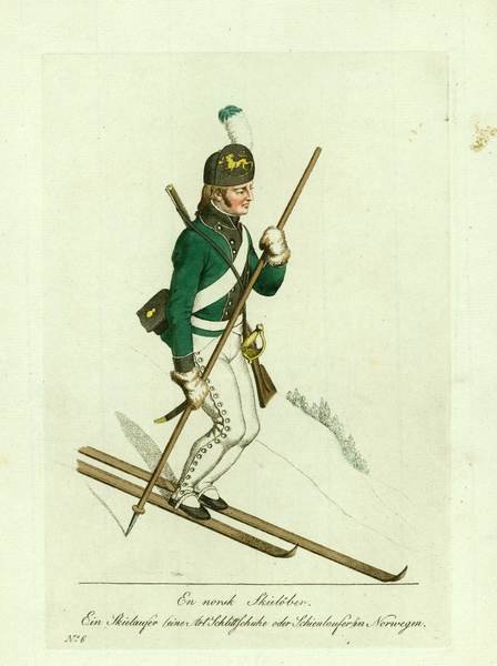Bilde: Tegnet av Johannes Senn:"En norsk Skieløber." publisert 1811, fra wikipedia.